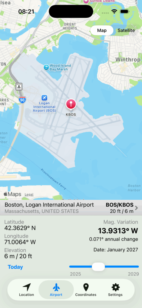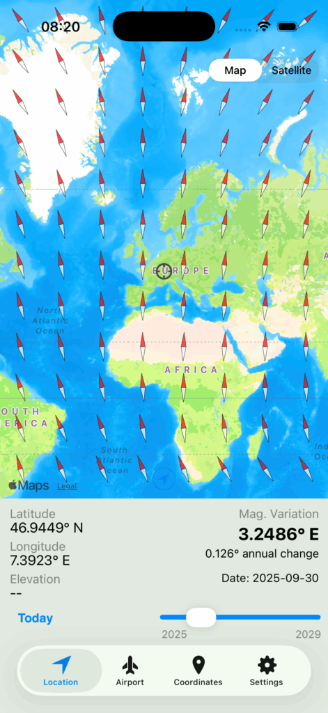 AeroVariation calculates the magnetic variation based on the World Magnetic Model (WMM) for any location and year between 2025 and 2029 or the current date.